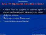 Среден брой на ударите за единица време и среден свободен пробег на молекулите на газ Дифузия в газове Вътрешно триене. Вискозитет Топлопроводност при газове...